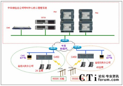 中華保險呼叫中心采用IP分布式架構(gòu),總公司由一套S8730媒體服務(wù)器,4個G650組成2個PN,外加一臺CMS報表服務(wù)器組成。各地分支機構(gòu)采用G450網(wǎng)關(guān)通過中華保險內(nèi)部數(shù)據(jù)專用網(wǎng)絡(luò)與總公司核心管理系統(tǒng)交互。其中省級B類分公司為60數(shù)字中繼線接入,48坐席。省級A類分公司為30路數(shù)字中繼接入,24坐席。各公司坐席采用AVAYA2410D數(shù)字話機,可以提供豐富的呼叫中心話機功能,方便坐席人員使用。