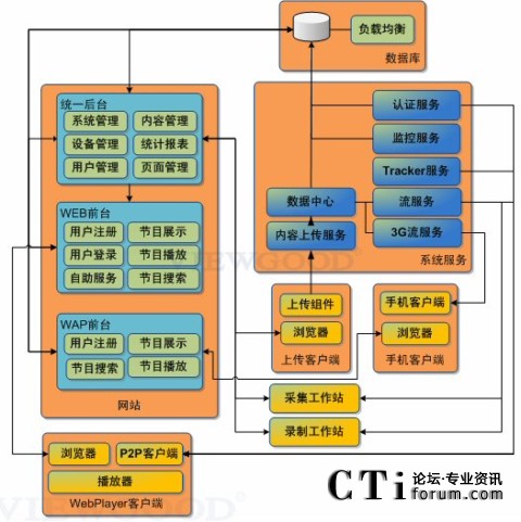 系統(tǒng)由“統(tǒng)一”管理后臺、Web前臺、WAP前臺、WebPlayer播放器、手機客戶端、采集工作站、錄制工作站、上傳客戶端、服務系統(tǒng)組成。之前已經(jīng)使用我們PC流媒體服務平臺的用戶,可以與手機流媒體系統(tǒng)合用一個后臺管理,實現(xiàn)了手機和PC平臺的統(tǒng)一后臺管理。