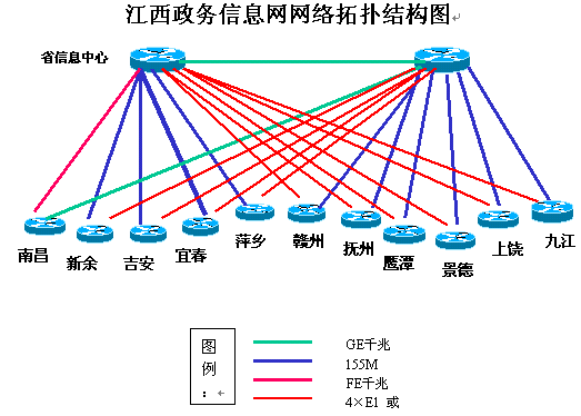 江西省于2002年8月開始實施省政務信息網縱向網省市聯(lián)網工程,于2002年12月底實施完畢。目前,在南昌地區(qū)已建成省級政務核心網及政務專網,省委、省政府、省人大、省政協(xié)及一百多個省直部門,已通過光纜實現(xiàn)了橫向網絡互聯(lián)。