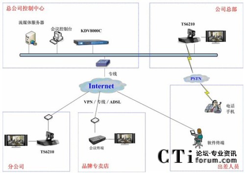 科達(dá)TrueSens視頻會(huì)議系統(tǒng)最大的特點(diǎn)就是擁有超強(qiáng)的網(wǎng)絡(luò)適應(yīng)性。由于采用了高效視音頻編碼技術(shù)和大量智能化網(wǎng)絡(luò)適應(yīng)技術(shù),無論是ADSL、光纖還是VPN,均可進(jìn)行快速接入,并充分保證在Internet環(huán)境下的會(huì)議效果。勁霸此次視頻會(huì)議系統(tǒng)就是基于Internet進(jìn)行部署的。如圖1。