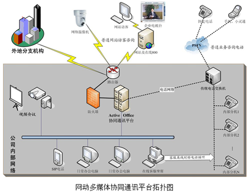 在上圖所示的Active Office客戶應(yīng)用圖中,網(wǎng)動(dòng)協(xié)同通訊平臺(tái)承擔(dān)了統(tǒng)一通信中心樞紐的作用,將語音、視頻、數(shù)據(jù)完美結(jié)合,使IP網(wǎng)絡(luò)與電話網(wǎng)絡(luò)、本地網(wǎng)絡(luò)與遠(yuǎn)程網(wǎng)絡(luò)互聯(lián)互通,在同一個(gè)平臺(tái)上交互協(xié)同。