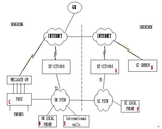 - A點(diǎn)是深圳福田的office,B點(diǎn)是深圳蛇口的辦事處,C點(diǎn)是香港總部的office,D點(diǎn)香港本地電話(huà)用戶(hù),E點(diǎn)來(lái)自國(guó)際的呼叫,F(xiàn)點(diǎn)是深圳本地的電話(huà)用戶(hù)。
