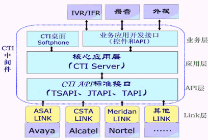 CTI中間件用來在計算機應(yīng)用系統(tǒng)和交換設(shè)備之間充當接口作用,起著承上啟下的作用;CT中間件向下提供通用性支持(對主要交換機消息接口和符合CSTA標準的交換設(shè)備的支持);向上提供應(yīng)用接口或開發(fā)控件,包括呼叫控制、座席管理以及其他設(shè)備接口等功能,這些是CT中間件的核心功能。但目前CTI中間件已經(jīng)拓寬了該應(yīng)用范圍,CTI中間件還向上延伸了功能,提供了一部分業(yè)務(wù)應(yīng)用和業(yè)務(wù)管理功能,如業(yè)務(wù)系統(tǒng)、監(jiān)控系統(tǒng)、計費系統(tǒng)、呼叫統(tǒng)計報表的應(yīng)用。