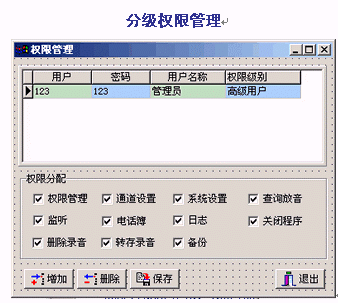 。。通話錄音或留言進行查詢管理,可按日期、時間、電話號碼、線路、通話長度、人員等條件對錄音進行快速檢索、播放,也可將錄音文件進行刪除、標記、轉(zhuǎn)存、備份等操作。分級權限管理