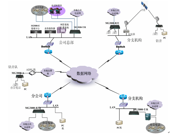 對規(guī)模比較小的辦事處,或者遠端的鉆井隊,一般在本地都是采用ADSL接入這樣方式,這樣情況可以直接配置MG3000-A語音往關,實現語音數據同傳方式。MG3000-A提供1、4、8口多種方式供實際情況來選擇。所有的號碼可以直接在總部中心的平臺來分配控制。