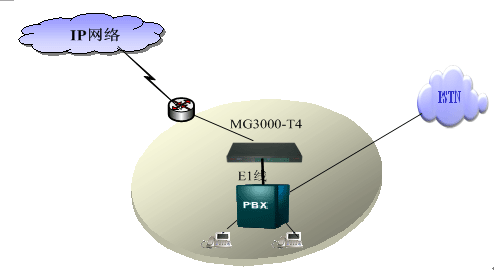 MG3000-T4提供1、2、4E1中繼,直接提供數字中繼口和PBX交換機對接,PBX交換機原有的撥號習慣和撥號方式不做改變,可以通過路由選擇的方式來走原來的PSTN網絡或者IP網絡,同時通過MG3000-T4來做電路交換和IP網的分組交換的轉換,實現該分支機構和其他分支機構的互連互通。