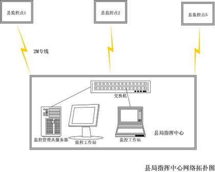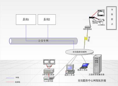 網(wǎng)絡(luò)視頻服務(wù)器對(duì)前端監(jiān)控點(diǎn)攝像機(jī)采集的視頻信號(hào)進(jìn)行編碼壓縮處理后,通過2M專線上傳到市公安局監(jiān)控中心。