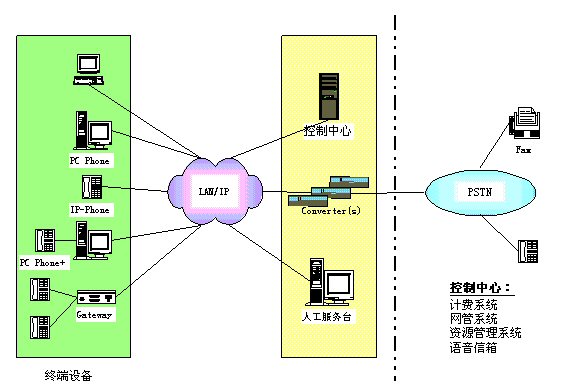 控制中心:包括資源管理系統(tǒng)、計費(fèi)系統(tǒng)、網(wǎng)管系統(tǒng)、語音信箱。 其中,資源管理系統(tǒng)主要執(zhí)行地址翻譯、權(quán)限控制、路由管理等功能;計費(fèi)系統(tǒng)主要完成計費(fèi)及結(jié)算功能;網(wǎng)管系統(tǒng)完成對網(wǎng)絡(luò)及IP