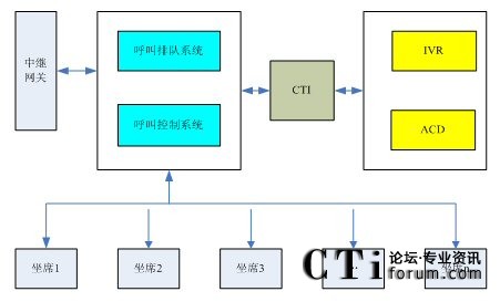 呼叫排隊系統(tǒng)首先將進入系統(tǒng)的呼叫進行排隊,并將新來的呼叫上報給IVR系統(tǒng)。IVR系統(tǒng)向排隊的用戶播放提示音樂,同時ACD系統(tǒng)根據(jù)呼叫分配策略選擇一個空閑的坐席。在選定坐席以后,CTI接口將呼叫控制命令傳到呼叫控制系統(tǒng),呼叫控制系統(tǒng)將呼叫轉(zhuǎn)接到指定的坐席。坐席人員開始對客戶的呼叫進行應答受理。