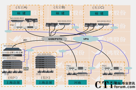 - 上海接入采用電信30B+D線路兩條。使用2E1的MG3000-T4設(shè)備接入。上海南區(qū)IP分機(jī)600門,北區(qū)IP分機(jī)300門,全部采用MG3000-R32(32FXS)設(shè)備做接入。福建龍巖A、B、C,江西高安,河南鄭州這5個分支分別采用16FXO口網(wǎng)關(guān)與PBX或電信虛擬網(wǎng)直線互聯(lián)。
