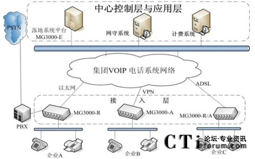 各單位利用自己的網(wǎng)絡(luò)組建集團VOIP語音網(wǎng)絡(luò)。無論是在國內(nèi)的各單位總部及其分支還是海外的企業(yè)分支,不管是通過專網(wǎng)還是ADSL等連入集團管理平臺,都可以利用這個管理平臺傳輸語音業(yè)務(wù),總部和各分支機構(gòu)可以通過不同的網(wǎng)絡(luò)接入手段。