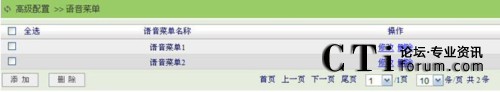 點(diǎn)擊“高級配置”菜單的“語音菜單”子菜單,進(jìn)入語音菜單頁面,頁面默認(rèn)顯示系統(tǒng)已經(jīng)配置的所有語音菜單列表信息,在這里用戶可以創(chuàng)建新的語音菜單、修改刪除已有的語音菜單,如下圖所示: