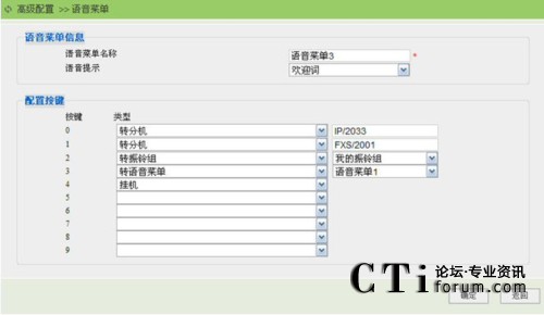 在此頁面可以定義語音菜單的名字,可以指定進(jìn)入此菜單后播放的音樂,還可以為每個(gè)鍵選擇合適的操作。支持0-9數(shù)字按鍵定義,每個(gè)鍵可選擇如下五個(gè)動(dòng)作之一: