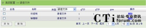 點(diǎn)擊“高級配置”菜單的“語音文件”子菜單,進(jìn)入語音文件頁面,在類型選項(xiàng)中可以選擇顯示語音文件或音樂保持文件,語音文件指的是語音菜單、振鈴組等業(yè)務(wù)使用的語音文件;音樂保持文件指的是呼叫保持,三方通話等業(yè)務(wù)用戶聽到的音樂保持文件。如下圖所示: