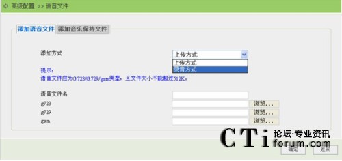 在定制語音菜單時(shí),經(jīng)常要提供聲音文件,目前系統(tǒng)支持G.723、G.729和gsm(針對G.711a和G.711u)類型的語音文件和音樂保持文件,單個(gè)文件大小不能超過512K。MG3000-X中的語音文件可以通過錄制或者上傳方式提供。