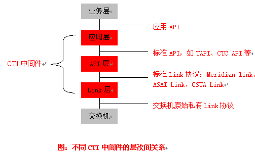 API層產(chǎn)品:實(shí)現(xiàn)把標(biāo)準(zhǔn)Link協(xié)議轉(zhuǎn)化為標(biāo)準(zhǔn)的API,如CTC API、TAPI、JTAPI等,為CTI應(yīng)用開發(fā)提供一套標(biāo)準(zhǔn)的API,屏蔽了不同交換機(jī)擁有的CTI協(xié)議和CTI接口,使應(yīng)用程序員無需關(guān)心消息是如何在計(jì)算機(jī)和交換機(jī)之間傳遞,專注于客戶端的應(yīng)用開發(fā),實(shí)現(xiàn)應(yīng)用程序與交換機(jī)平臺無關(guān)性。