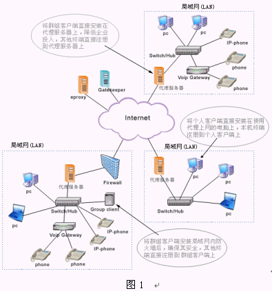 該系統(tǒng)建立在NGN基礎(chǔ)上,包括交換中心Asiasoft Gatekeeper,解決NAT、防火墻的代理軟件eProxy和視頻多點控制單元MCU,這些都建立在ITU制定的標準H.323協(xié)議上。一般單位和企業(yè)為便于管理和應(yīng)用,都建設(shè)了使用私有IP 地址的局域網(wǎng)(LAN),當需要訪問外網(wǎng)時必須進行地址轉(zhuǎn)換(NAT)。局域網(wǎng)內(nèi)的終端之間進行呼叫和通信時沒有任何問題,但與外網(wǎng)終端進行VoIP通信時就會有問題產(chǎn)生,原因是局域網(wǎng)中的IP地址是私有的,在Internet中不可路由。為了解決VoIP通信協(xié)議不能穿越防火墻和NAT的問題,亞軟軟件技術(shù)股份有限公司推出了eProxy代理軟件。它可以在確保網(wǎng)絡(luò)安全、不改變已有設(shè)備和網(wǎng)絡(luò)環(huán)境的情況下,為用戶實現(xiàn)實時的點對點IP語音、視頻和數(shù)據(jù)通信服務(wù)。(如圖1所示)