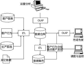 數(shù)據(jù)主要有四個方面的來源:客戶信息、客戶行為、生產(chǎn)系統(tǒng)和其它相關(guān)數(shù)據(jù)。這些數(shù)據(jù)通過抽取、轉(zhuǎn)換和裝載過程,形成數(shù)據(jù)倉庫,并通過OLAP和報表,將客戶的整體行為分析和企業(yè)運營分析等傳遞給數(shù)據(jù)倉庫用戶。