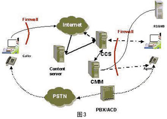 ----圖2說明了在集成互聯(lián)網(wǎng)電話網(wǎng)關(guān)時進(jìn)行協(xié)同會話的流程,圖中實(shí)線為數(shù)據(jù)信息傳遞的鏈路,虛線為語音傳遞的鏈路。通過ITG和PBX/ACD 的特定交互接口,將呼叫中心外部的IP電話鏈路集成到CCIS系統(tǒng)中。值得注意的是,ITG 和CCS需要安裝在企業(yè)防火墻的外側(cè),以方便呼叫者的訪問。
