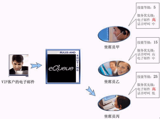 我們假設(shè)在某個(gè)聯(lián)絡(luò)中心里,有甲、乙、丙三位坐席員工作在同一個(gè)項(xiàng)目組(坐席組)。甲是新員工,只具有基本服務(wù)技能,經(jīng)驗(yàn)很有限;乙是一位擁有豐富經(jīng)驗(yàn)的坐席員,語音呼叫應(yīng)答技巧非常嫻熟,具有回復(fù)電子郵件的技能但是熟練程度略低于語音應(yīng)答技能;丙是一位經(jīng)驗(yàn)豐富、技能全面的坐席員,業(yè)務(wù)熟練,其最擅長的是回復(fù)客戶的電子郵件。假設(shè)有一位重要客戶發(fā)來電子郵件咨詢一個(gè)非常專業(yè)的技術(shù)問題。由于這是一位VIP客戶,服務(wù)條款中規(guī)定了他所有的呼叫請(qǐng)求都必須由經(jīng)驗(yàn)豐富的坐席員來響應(yīng)。在eQueue多媒體單一隊(duì)列中,他的電子郵件被限定為坐席員的技能只有達(dá)到或超過等級(jí)15才有資格回復(fù)。在3個(gè)坐席員中,甲因?yàn)榧寄艿燃?jí)只有5,不能滿足回復(fù)郵件的先決條件,雖然擁有此項(xiàng)技能且優(yōu)先級(jí)為高,依然沒有資格響應(yīng)這個(gè)聯(lián)絡(luò)請(qǐng)求;乙、丙的技能等級(jí)都滿足回復(fù)郵件的條件,但是丙的此項(xiàng)技能服務(wù)優(yōu)先級(jí)為高,因此,在丙坐席員處在可服務(wù)狀態(tài)下,eQueue會(huì)將此VIP客戶的電子郵件優(yōu)先派發(fā)給她。只有當(dāng)她處于忙碌狀態(tài)時(shí),才會(huì)派發(fā)給乙坐席員。