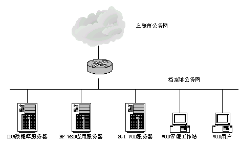 具體系統(tǒng)結(jié)構(gòu)拓?fù)涿枋鋈缦,檔案館公務(wù)網(wǎng)作為上海市公務(wù)網(wǎng)的子網(wǎng),以100Mb/s的速率聯(lián)入上海市公務(wù)網(wǎng),為保證安全可靠,采用加密機(jī)提高安全級別;整體系統(tǒng)將部署四臺服務(wù)器: