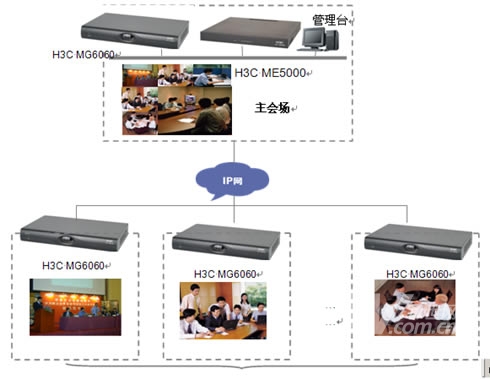在主會場,分會場的會議室配備H3C高清視訊終端MG6060。H3C MG6060終端支持H.263、H.264等視頻編解碼協(xié)議,并采用了專有的視頻前、后處理技術(shù),使得圖像質(zhì)量大大提升,在周圍環(huán)境光照較差或者會場顏色搭配不甚和諧的情況下,仍舊能夠得到清晰、自然的圖像。視頻功能主要特色功能包括動態(tài)4CIF高清圖像、H.239雙視頻流傳送、畫中畫(PIP)、雙屏顯示、分屏顯示、VGA輸入、VGA輸出、桌面?zhèn)魉汀D像屏蔽、圖像參數(shù)調(diào)整等。有關(guān)H3C