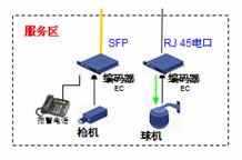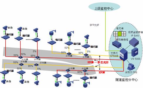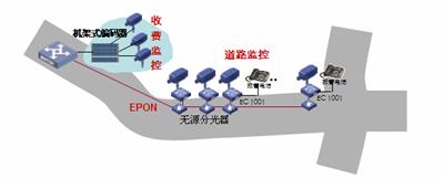 道路沿線監(jiān)控:采用EPON組網(wǎng),路況監(jiān)控球機(jī)接入前端編碼器,多個編碼器通過一根EPON光纖接入到中心交換機(jī)上,布線方便節(jié)省光纖資源。編碼器內(nèi)置交換機(jī)功能可以接入IP報(bào)警電話方便公路報(bào)警。還可以將支持IP接口的可變信號板和氣象站直接接入編碼器交換機(jī)端口,實(shí)現(xiàn)一網(wǎng)多用,降低整體網(wǎng)絡(luò)成本。