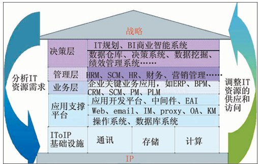 按照華為3Com的構(gòu)想,如果把整個(gè)IT系統(tǒng)比做一座房屋,那么整個(gè)房屋的地基就是IP網(wǎng)絡(luò),需要基于IP網(wǎng)絡(luò)來(lái)構(gòu)建通信、存儲(chǔ)、計(jì)算等IT基礎(chǔ)設(shè)施。在這些基礎(chǔ)設(shè)施之上,則是應(yīng)用支撐平臺(tái)(操作系統(tǒng)、數(shù)據(jù)庫(kù)系統(tǒng)、應(yīng)用開發(fā)平臺(tái)等),基于應(yīng)用支撐平臺(tái)提供給機(jī)構(gòu)的關(guān)鍵業(yè)務(wù)流程信息系統(tǒng)(如ERP、SCM等),最終為用戶的管理和決策提供支持!霸趹(zhàn)略與IT基礎(chǔ)設(shè)施之間實(shí)現(xiàn)實(shí)時(shí)同步互動(dòng),IT為用戶高層提供商業(yè)智能系統(tǒng)、決策系統(tǒng),以便決策層即時(shí)掌握信息,作為機(jī)構(gòu)戰(zhàn)略決策、戰(zhàn)略挑戰(zhàn)的依據(jù);用戶可以依據(jù)內(nèi)、外部變化,進(jìn)行戰(zhàn)略調(diào)整時(shí)快速分析新的IT資源需求,同步調(diào)整IT資源的配置,從而使IT與業(yè)務(wù)戰(zhàn)略保持同步!边@正是IToIP的基本理念。