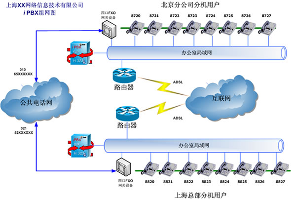 根據(jù)該用戶解決內部通訊費用的要求,在北京和上海兩個iPBX系統(tǒng)之間實現(xiàn)互通。兩套iPBX的外線通過普通模擬網(wǎng)關的FXO口與現(xiàn)存的PSTN線連接。