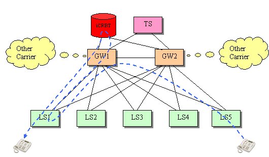 圖5 每個(gè)端局交換機(jī)配置一套iCRBT系統(tǒng)(有迂回)