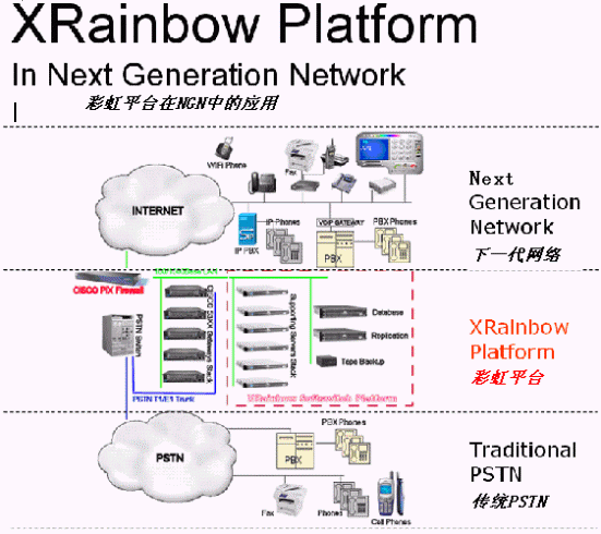 Xrainbow軟交換平臺它是基于SIP協(xié)議、針對中國現(xiàn)有Internet網(wǎng)絡狀況和現(xiàn)有網(wǎng)路硬件服務商的VoIP 設備的特點,為電信運營商和二級/虛擬運營商, 通信系統(tǒng)集成商提供運營于下一代新網(wǎng)絡(NGN, Next Generation Network)之上的一套集VoIP 語音及信號交換、管理及服務于一體的電信級系統(tǒng)平臺。X彩虹SIP軟交換系統(tǒng)包括以下的核心服務器如下認證服務器、路由服務器、配置服務器、功能服務器、語音郵件服務器、媒體轉(zhuǎn)發(fā)服務器和網(wǎng)絡管理服務器。我們的系統(tǒng)可以實現(xiàn)多種功能,功能模塊包括:監(jiān)控模塊、計費模塊、管理模塊、話吧模塊、代理商模塊、軟電話模塊、集團功能模塊、電話卡模塊、主叫認證模塊、回撥模塊、批發(fā)計費模塊、電話會議模塊等。