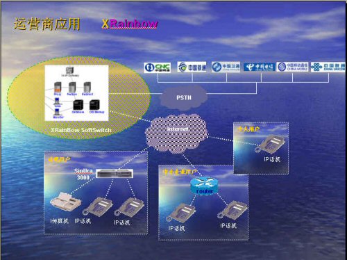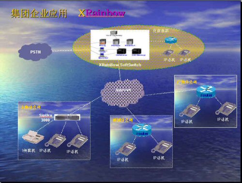 。。首先我們需要這4個(gè)地點(diǎn)都有自己的網(wǎng)絡(luò)接入,最好是寬帶。以北京總部為列,如果將Xrainbow系統(tǒng)放在北京總部,這就需要北京總部這邊有一個(gè)固定IP地址的網(wǎng)絡(luò)接入,其他分公司不需要固定ip地址,只要可以上網(wǎng)就可以登錄到北京總部的Xrainbow系統(tǒng)。這樣企業(yè)與分支機(jī)構(gòu)之間就實(shí)現(xiàn)了零話費(fèi),同時(shí)還可以提供傳真業(yè)務(wù)。另外終端設(shè)備可以隨意移動(dòng),只要可以上網(wǎng)的地方就可以接入我們的終端設(shè)備,免去了因公司的發(fā)展或者搬動(dòng)而要去申請初裝大量電話的煩惱。