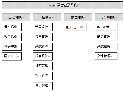 NetLog語音記錄系統(tǒng)采用基于分布式、多層控制管理體系的設計思想,將電話線路與內(nèi)部網(wǎng)絡有效地結(jié)合在一起,形成一套完整的語音錄制、管理系統(tǒng)。采用目前先進的C/S模型,能更方便、快捷地實現(xiàn)控制臺對網(wǎng)絡內(nèi)所有記錄服務的狀態(tài)監(jiān)視,記錄查詢,操作控制等,采用統(tǒng)一的管理化機制,使文件的管理和備份更簡潔。