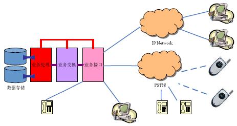 其中,業(yè)務(wù)接口部分為呼叫中心提供面向服務(wù)服務(wù)對象(客戶)的連接和面向服務(wù)者(座席)的連接接口,業(yè)務(wù)交換部分負(fù)責(zé)在請求服務(wù)的對象與提供服務(wù)提供者之間建立連接,業(yè)務(wù)處理部分負(fù)責(zé)對這些連接及服務(wù)內(nèi)容進(jìn)行管理和維護(hù),數(shù)據(jù)存儲部分則為所有服務(wù)提供必要的數(shù)據(jù)資源和數(shù)據(jù)備份。