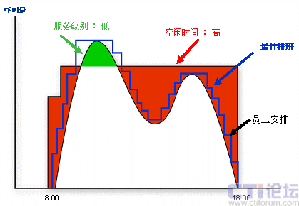如果僅僅是工作量大,我想排班員還能夠忍受,更要命的是,排出的班表不能做到精確。要么人員太多,導致運營成本上升;要么人員不夠,無法達到預期的服務目標。以呼叫中心典型的雙峰曲線為例(如右圖),排班所追求的是人力安排和話務曲線的盡可能吻合(也就是圖中藍色的最佳排班線),達到在滿足服務水平的基礎上盡可能少的安排座席資源。而在手工排班中,由于大量的采用組排班,組中成員同時上下班、同時午餐,導致人力安排的靈活性降低,不能盡可能的去擬合話務曲線。此外,參考前面談到的影響人力安排的因素,手工排班中考慮了環(huán)境的影響,部分考慮了縮減,但座席技能因素考慮很少,基本認為所有人員的技能熟練度一致,不可預見性縮減也沒有考慮進去,導致最終會對服務水平造成負面影響。因此,手工排班是一種粗放型的排班方式,隨著運營要求的提高,表現(xiàn)出一定的不適應性。