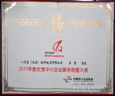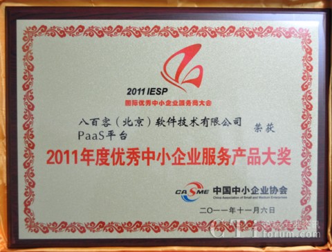 作為國內首家SaaS廠商,八百客積極推動云計算在中小企業(yè)中的宣傳與運用。2006年,八百客在國內率先推出管理自動化開發(fā)平臺800APP, 它擴展了按需服務,并實現(xiàn)了客戶可根據(jù)需要自定制應用程序,成為了改變應用程序開發(fā)的一個新途徑。為表彰八百客在中小企業(yè)信息化中做出的杰出貢獻,本次大會特別為八百客頒發(fā)了“2011年度優(yōu)秀中小企業(yè)服務產(chǎn)品大獎”,此外還授予八百客總經(jīng)理李智 “2011年度優(yōu)秀中小企業(yè)服務明星大獎”。