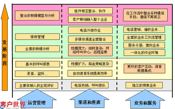 如圖一所示,國內(nèi)大多數(shù)企業(yè)呼叫中心基本經(jīng)歷了三個階段的發(fā)展,在呼叫中心建設(shè)初期,往往只是建設(shè)成電話熱線,座席人員接通電話,通過與客戶交流,利用簡單獨(dú)立的呼叫中心應(yīng)用系統(tǒng),完成咨詢和接受訂單工作,在這階段對呼叫中心來講基本沒有什么管理,主要靠人的主觀評價來實(shí)現(xiàn)粗放運(yùn)營。