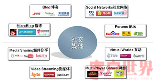在國外這些網(wǎng)絡新媒體包括: SNS社交網(wǎng)絡(如FACEBOOK)、BLOGS博客、WIKI維基(WIKIEPEDIA\WIKITRAVEL、內(nèi)容分享(如圖片分享FLICKR\視頻分享YOUTUBE\社會標簽DEL)、社區(qū)(包括傳統(tǒng)的BBS社區(qū)和新興的3D社區(qū)如第二人生等)和微博(如TWITTER)等。在國內(nèi)也涌現(xiàn)了一批社交媒體,如新浪、騰訊微博,天涯社區(qū)、開心網(wǎng)等。