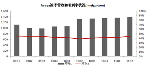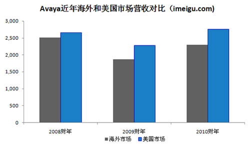 2008、2009、2010財年Avaya總營收分別為49.23億美元、41.50億美元、50.60億美元,2009財年營收受宏觀經濟(金融海嘯)因素影像而出現15.7%的下降,2010財年Avaya公司收購原北電的企業(yè)通信部門(NES),受此合并報表影響和經濟復蘇因素,2010財年營收相比2009財年增長21.9%。