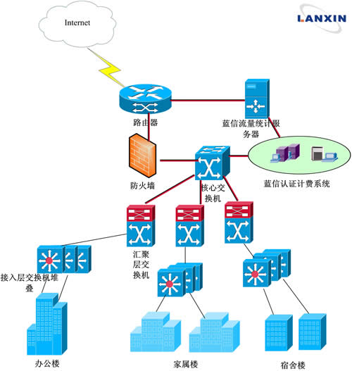 在學校的網絡中心部署藍信認證計費系統(tǒng),負責對用戶的集中統(tǒng)一管理;此外,在網絡的出口處部署藍信流量統(tǒng)計工具,負責對所有流量進行采集,網管者通過客戶端實現對用戶的管理和控制。