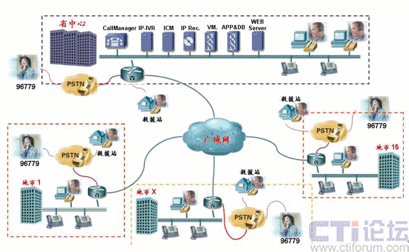 如上圖所示,由于Cisco IPCC是基于標(biāo)準(zhǔn)IP網(wǎng)絡(luò)的純IP呼叫中心解決方案,呼叫中心的核心設(shè)備都只部署在省中心機(jī)房,其它地市只需要在原有網(wǎng)絡(luò)的路由器上添加語音模塊即可實(shí)現(xiàn)PSTN語音的本地接入,而無需再各地市購買額外的接入設(shè)備。而同樣由于IP網(wǎng)絡(luò)的特性,呼叫中心的坐席可以根據(jù)需要部署在甘肅省運(yùn)輸管理局IP網(wǎng)絡(luò)可達(dá)的任何一個(gè)地方,各地市的坐席只需要配備IP電話和座席PC即可。來自PSTN的電話根據(jù)用戶在IVR中的選擇和其它路由策略,自動(dòng)分配到最適合的坐席處理,譬如來自白銀的運(yùn)政投訴由白銀市本地的運(yùn)政大廳座席人員處理。