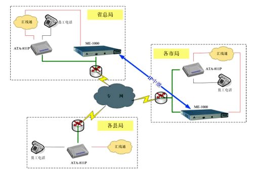 由于用戶數(shù)量較大,我們建議采取分級(jí)管理方式,利用我們Anta科技(北京)有限公司Simplicity 系列IP-PBX產(chǎn)品的靈活性,在每個(gè)市局放置一臺(tái)ME-1000型號(hào)的IP-PBX,管理市局及下屬縣區(qū)局的電話系統(tǒng);省總局放置一臺(tái)ME-1000,管理總局電話系統(tǒng);同時(shí)各市局的ME-1000向總局注冊(cè),形成IP中繼連接,組成全省互通的IP電話管理系統(tǒng)。在終端方面,我們建議采用單端口的ATA-811P桌面型語(yǔ)音網(wǎng)關(guān)連接話機(jī),該網(wǎng)關(guān)通過(guò)向IP-PBX注冊(cè),將所有模擬話機(jī)連接到VOIP系統(tǒng)中來(lái)。