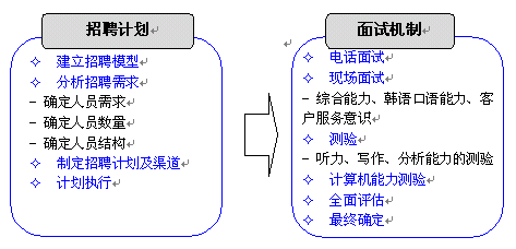 東軟呼叫中心充分挖掘東北地區(qū)豐富的韓語人才資源,通過多種招聘渠道滿足項目的人才需求。東軟自身的教育機構(gòu)--東軟信息學(xué)院也可以培養(yǎng)專業(yè)的韓語人才,另外,東軟信息學(xué)院與韓國某大學(xué)進(jìn)行戰(zhàn)略合作,通過為韓國留學(xué)生提供呼叫中心實習(xí)機會及漢語培訓(xùn)等,方式,吸引數(shù)名高素質(zhì)韓國大學(xué)生加入呼叫中心,充分滿足該項目對專業(yè)人才的需求。