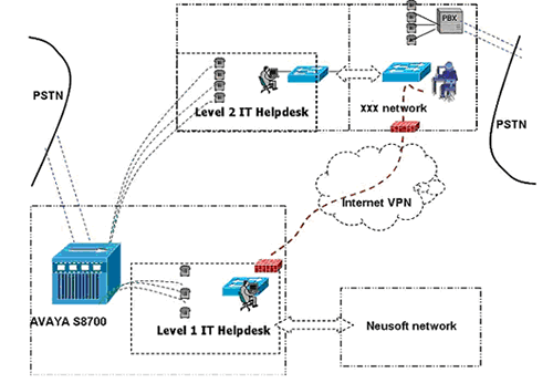 實(shí)施中,A公司的IT Helpdesk服務(wù)熱線號(hào)碼直接路由至東軟呼叫中心平臺(tái),Level 1座席用東軟呼叫中心的分機(jī)提供在線服務(wù);Level
