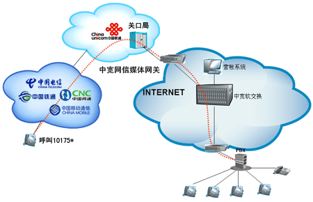 企業(yè)自行從網(wǎng)站上成功申請“企業(yè)商務(wù)通”業(yè)務(wù)后,通過101756*全國統(tǒng)一接入號結(jié)合網(wǎng)關(guān)和PBX,當(dāng)外部對企業(yè)申請的10175*號碼發(fā)起呼叫時,該呼叫通過中國聯(lián)通的線路將話務(wù)指向中寬網(wǎng)信的媒體網(wǎng)關(guān),由中寬軟交換平臺將呼叫送至指定的PBX上,由PBX接續(xù)至總臺或相應(yīng)分機(jī)。另外,當(dāng)您使用該業(yè)務(wù)外呼時,可以選擇在被叫電話上顯示10175*或隱藏號碼。