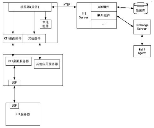 對于所有的電力業(yè)務模塊都是在IE瀏覽器上實現(xiàn),瀏覽器上的應用模塊對WEB Server發(fā)出請求,WEB Server解釋運行ASP程序,利用ASP創(chuàng)建數(shù)據(jù)庫組件訪問系統(tǒng)的數(shù)據(jù)庫信息;利用嵌入WEB頁面的CTI桌面控件可以實現(xiàn)CTI集成功能,如:建立呼叫、應答呼叫、席間轉移、人工自動切換等等;利用其他嵌入WEB網(wǎng)頁的組件實現(xiàn)其他擴展功能,如:Exchange