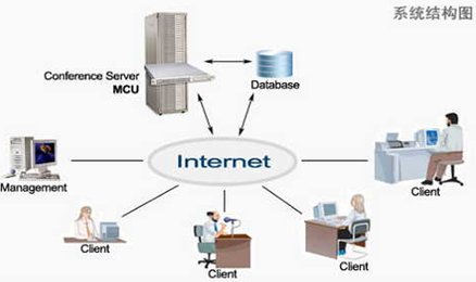 經(jīng)過種種測(cè)試,最后選定視維Super-V視頻會(huì)議系統(tǒng),山大聯(lián)潤(rùn)研發(fā)的視維視頻會(huì)議系統(tǒng)由服務(wù)器端軟件和客戶端軟件兩部分組成。其中安裝服務(wù)器端軟件的PC服務(wù)器必須有公網(wǎng)固定的IP地址;有較好的網(wǎng)絡(luò)帶寬條件,以保證正常的音視頻信號(hào)的傳輸。所有會(huì)議成員都需要在其個(gè)人計(jì)算機(jī)上安裝客戶端軟件,可以根據(jù)具體情況接入IP網(wǎng)絡(luò)。視維Super-V視頻會(huì)議系統(tǒng)將所參會(huì)人員通過IP網(wǎng)絡(luò)連接起來,提供音頻、視頻以及數(shù)據(jù)協(xié)作等通訊服務(wù)。其網(wǎng)絡(luò)拓?fù)鋱D如下: