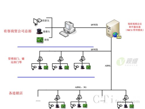 有容商貿(mào)大規(guī)模網(wǎng)絡(luò)遠(yuǎn)程會議和培訓(xùn)系統(tǒng)由服務(wù)器端和客戶端組成,服務(wù)器端軟件部署在公司中心機(jī)房,中心機(jī)房配置1臺單獨(dú)服務(wù)器,支持400個(gè)客戶端同時(shí)在線,負(fù)責(zé)所有會議和培訓(xùn)的召集、音視頻交互、加密等工作,有容商貿(mào)各部門、轄下各連鎖店通過WEB方式(包括ADSL、3G無線等多種網(wǎng)絡(luò))即可實(shí)現(xiàn)客戶端軟件的自動安裝與升級,配備簡單的攝像頭和話筒之后就可以實(shí)現(xiàn)有容商貿(mào)以及連鎖店的大規(guī)模工作會議和高清音視頻網(wǎng)絡(luò)培訓(xùn)。網(wǎng)絡(luò)拓?fù)鋱D如下: