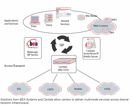 BEA提供領(lǐng)先的SOA基礎(chǔ)架構(gòu),同時它還提供可以在即使是完全不同的IT環(huán)境中建立應(yīng)用和管理SOA的強(qiáng)大的、 基于標(biāo)準(zhǔn)的平臺。BEA WebLogic Communications Platform (WebLogic 通信平臺)是第一個提供在運(yùn)營商級環(huán)境中、全業(yè)務(wù)功能的融合IT和電信的平臺。它使得運(yùn)營商可以通過加強(qiáng)利用固網(wǎng)和無線網(wǎng)開展多樣的數(shù)字內(nèi)容和視頻服務(wù)的能力,從而增加收入。其WebLogic SIP 服務(wù)器提供了必需的呼叫建立和會話管理,但是,運(yùn)營商仍然需要高級的媒體處理能力,以及能夠與BEA 解決方案進(jìn)行互操作的標(biāo)準(zhǔn)接口,從而使得運(yùn)營商可以提供可擴(kuò)展的語音、視頻和多媒體服務(wù)。他們同時需要有媒體網(wǎng)關(guān)以實(shí)現(xiàn)跨網(wǎng)絡(luò)的連接。Cantata與BEA Systems 合作,提供與BEA的WebLogic SIP服務(wù)器可靠的交互操作性,同時,運(yùn)營商可以利用Cantata的SnowShore IP媒體服務(wù)器以及集成媒體網(wǎng)關(guān)1010實(shí)現(xiàn)跨固網(wǎng)和無線網(wǎng)語音和多媒體服務(wù)。