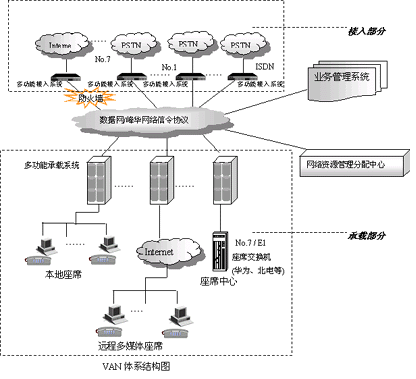 VAN(Voice Area Network)是一個(gè)支持多接入點(diǎn)、多承攬點(diǎn)、多業(yè)務(wù)點(diǎn)、多數(shù)據(jù)點(diǎn)的大型分布式呼叫中心構(gòu)造平臺(tái)。它針對(duì)大型分布式呼叫中心、企業(yè)營(yíng)銷網(wǎng)絡(luò)及行業(yè)公共交換平臺(tái)的業(yè)務(wù)需求和技術(shù)需求開(kāi)發(fā),支持多種接入方式并具備多種服務(wù)處理手段,同時(shí)可利用其軟件平臺(tái)——DCCMS呼叫管理系統(tǒng)對(duì)多種業(yè)務(wù)進(jìn)行分散式管理,對(duì)各類資源進(jìn)行統(tǒng)一控制,實(shí)現(xiàn)全網(wǎng)數(shù)據(jù)協(xié)同管理。